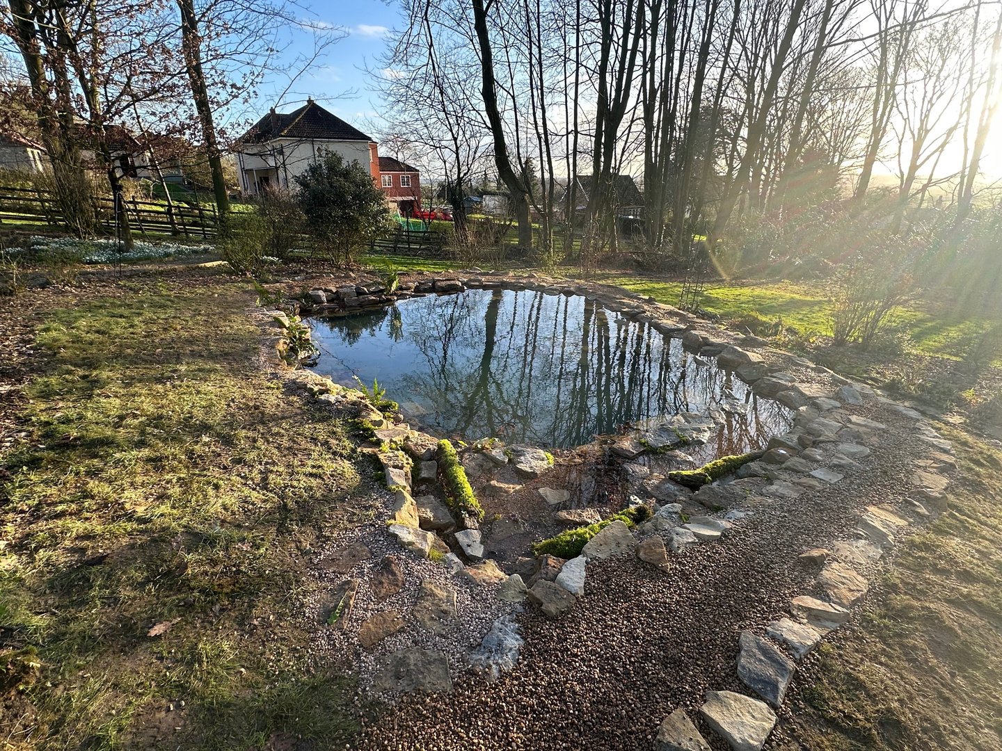 The excavated ground was compacted and leveled, raising the lower side to provide support for the water and ensuring the pond's surface was even. This created the ideal pond positioning to accomplish all the aforementioned goals. Remarkably, one year after construction, this pond boasts crystal-clear water, allowing visibility of the pebbles at its bottom, demonstrating its excellent condition. also with minimal Lillies needed for the pond allowing maximum pond view as possible because Lillies tend to take over the migratory