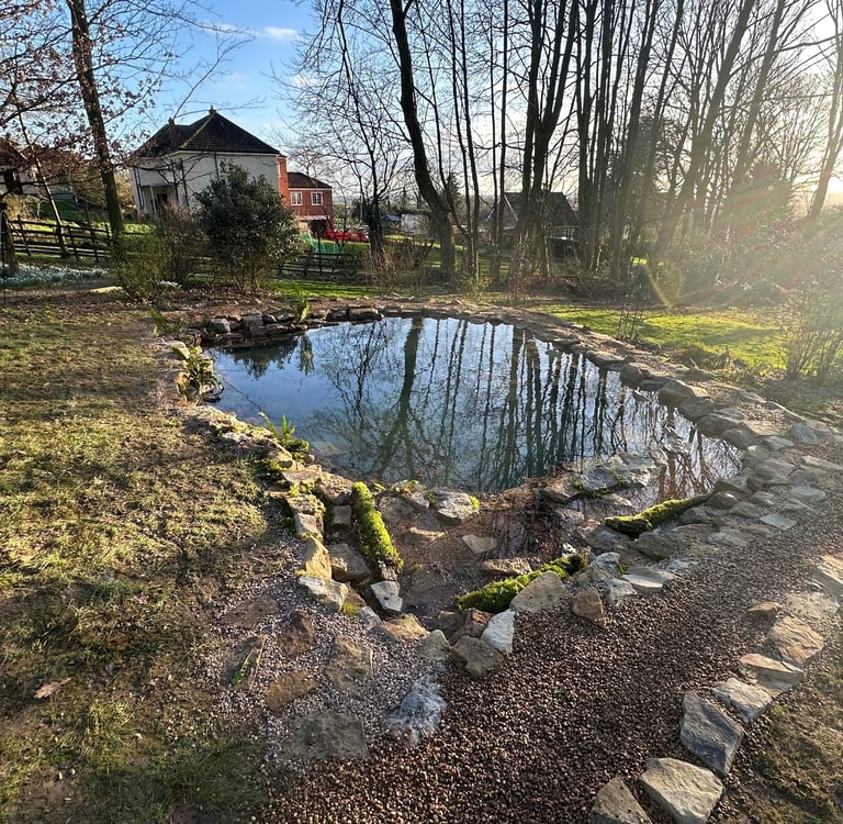 If you refer to the image below of the same pond one year post-installation, you will see that the points I mentioned earlier are crucial for the initial design of a wildlife pond. This wildlife pond was constructed on sloped terrain, but its location was vital due to the tree cover and the morning and afternoon sunlight, which allowed us to fully leverage its position to achieve the desired outcome depicted in the above image.