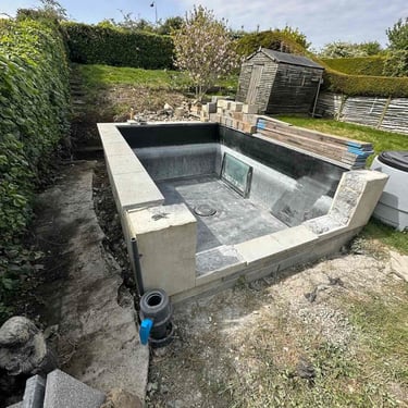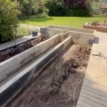 Project: Lincoln raised garden pond rebuild in concrete and fibreglass with added features.